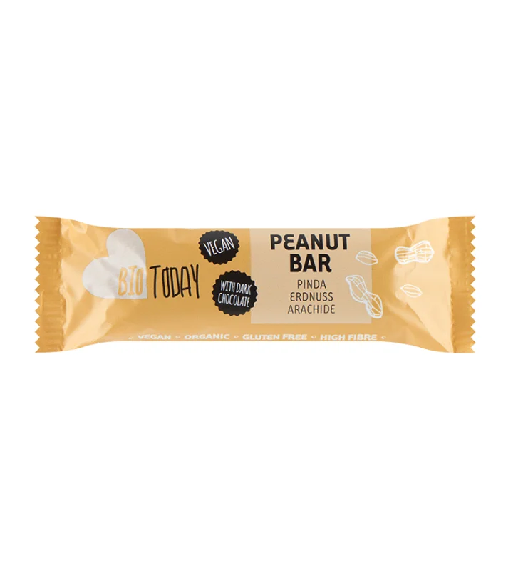 Batonul cu arahide BioToday este facut din ciocolata neagra, caramel si arahide. In plus, toate ingredientele batoanelor BioToday sunt complet vegane si, de asemenea, fara gluten. Acest lucru contribuie la sanatatea si bunastarea naturii si a mediului.