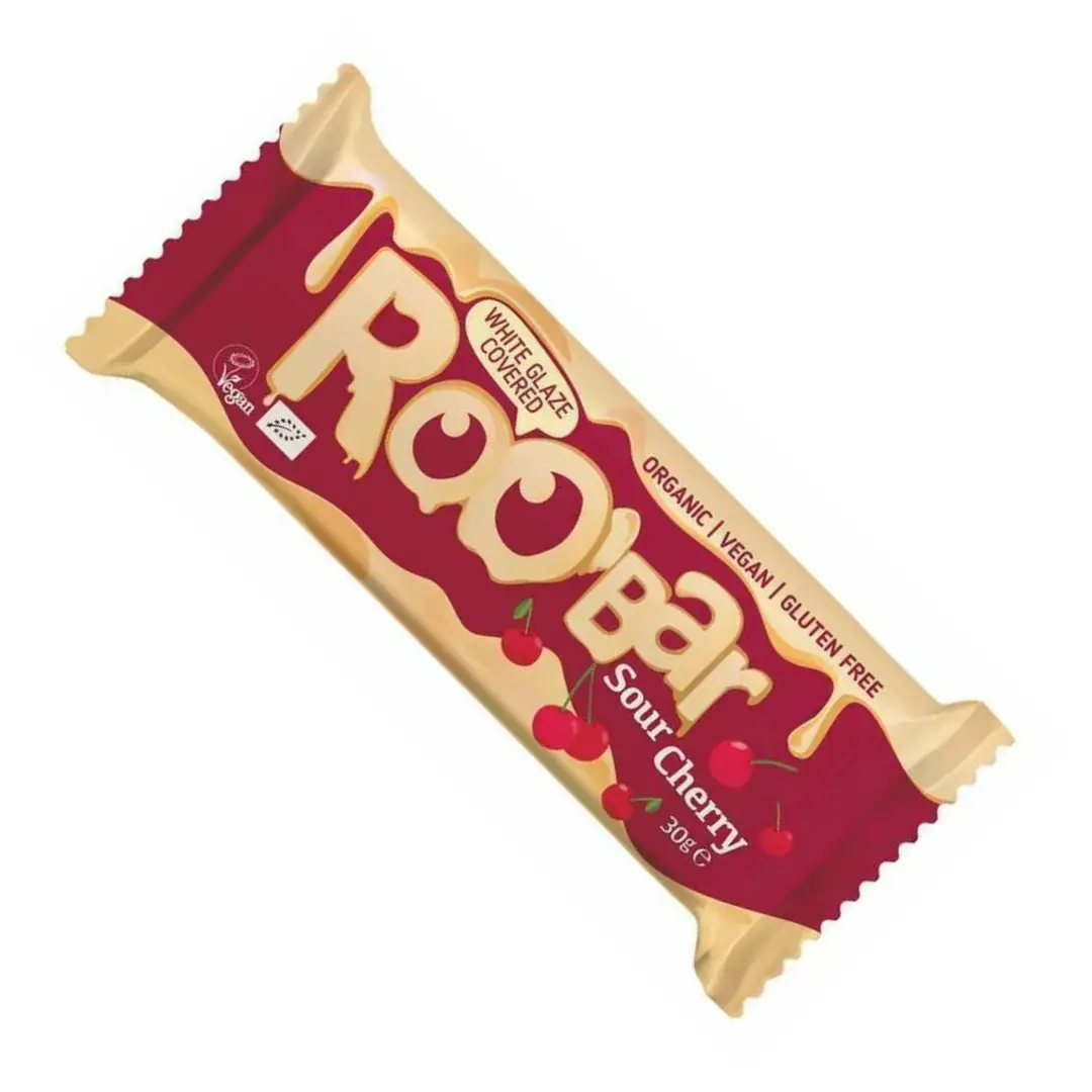 Baton cu visine invelit in glazura alba bio 30g Roobar
