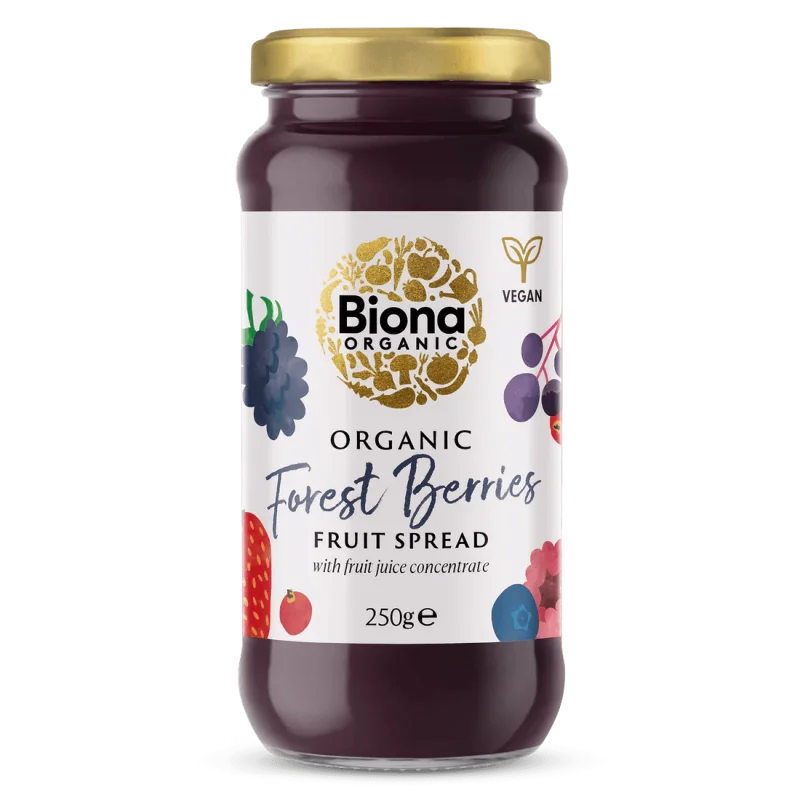 Gemul de fructe de padure Biona este bio, vegan, fara zahar rafinat, indulcit cu suc de fructe.