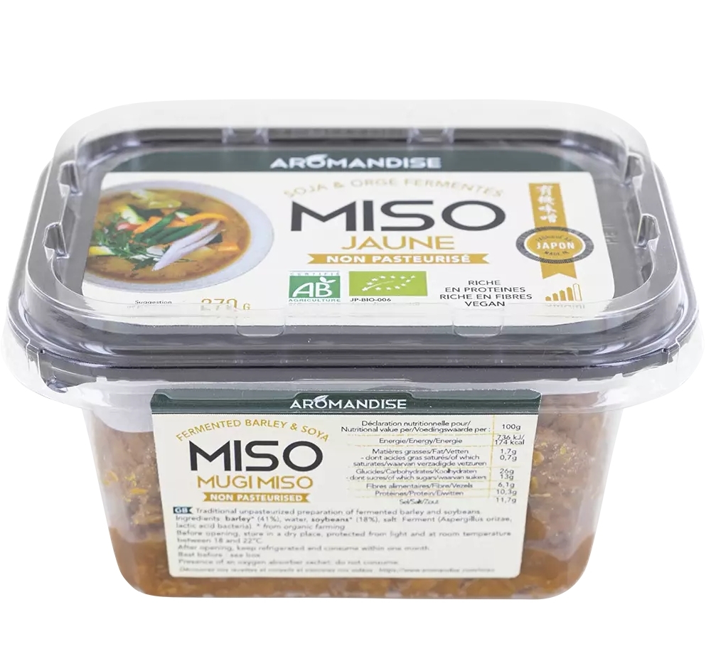 Aceasta delicioasa pasta este un superaliment obtinut in urma unei fermentatii traditionale a boabelor de soia bio nemodificate genetic si a orzului. Un aliment esential în bucataria japoneza, aceasta pasta miso are o aroma intensa de umami, ideal pentru toate preparatele tale precum supe, ciorbe, preparate cu sos, cartofi sau fierturi.