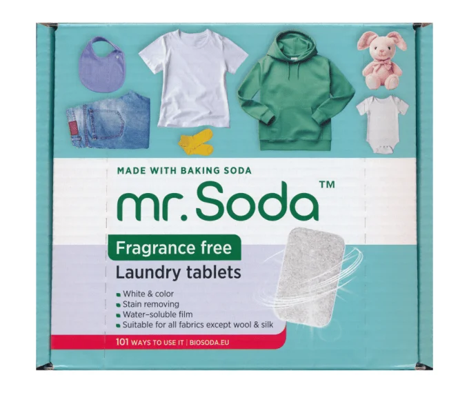 Tabletele pentru masina de spalat rufe cu bicarbonat de sodiu Mr.Soda sunt concepute pentru ingrijirea rufelor albe si colorate. Formula puternica elimina petele si murdaria, pastrand culoarea tesaturii chiar si dupa spalari frecvente.